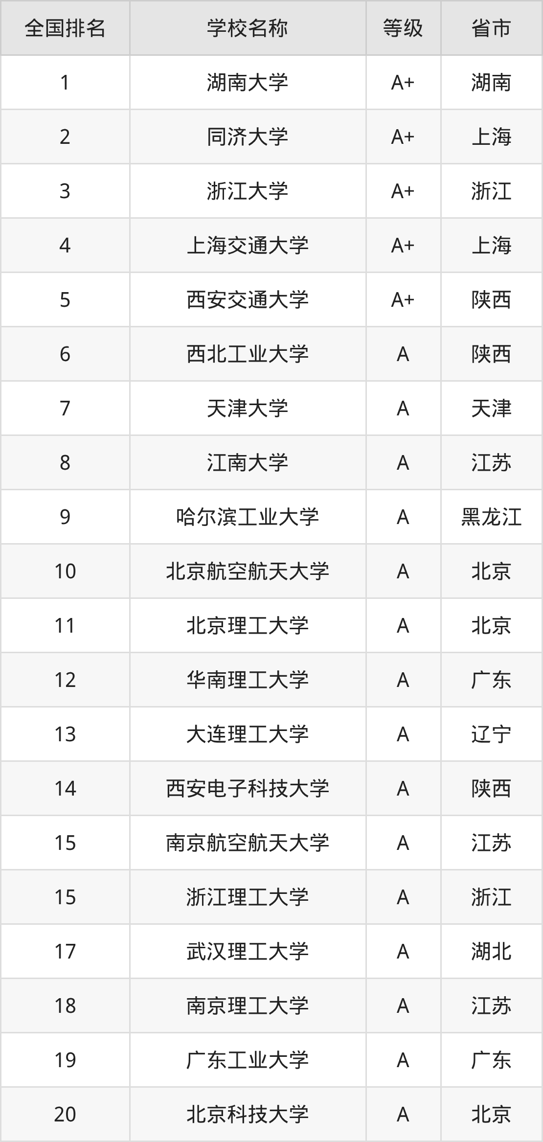 全国工业设计开设院校参与排名的共有132所,实力最强的是湖南大学(全国排名第1名),其专业实力等级被评为A+级。