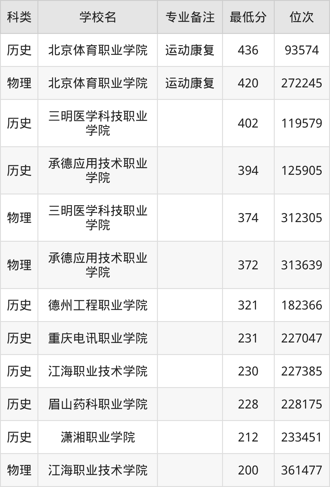 2025年全国大学体育保健与康复录取分数线在200分~436分之间。数据显示,考生如果想报考公办大学,分数要在372分及以上,最低分院校有承德应用技术职业学院等。