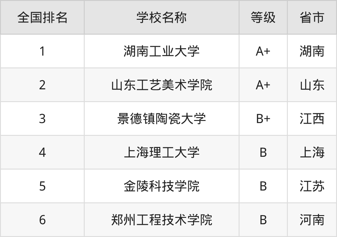 全国包装设计开设院校参与排名的共有6所,实力最强的是湖南工业大学(全国排名第1名),其专业实力等级被评为A+级。