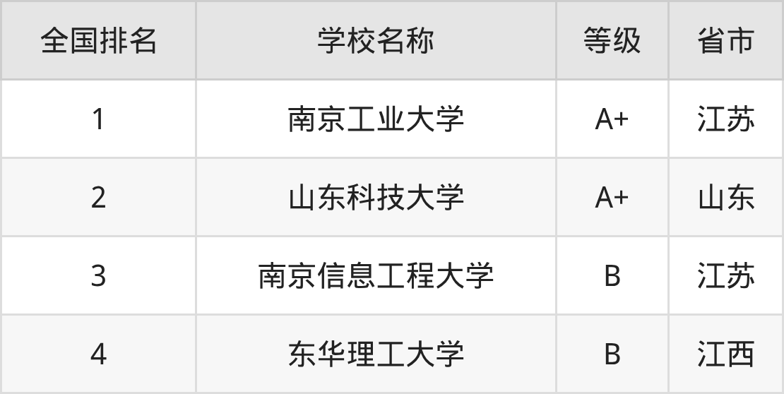 全国防灾减灾科学与工程开设院校参与排名的共有4所,实力最强的是南京工业大学(全国排名第1名),其专业实力等级被评为A+级。