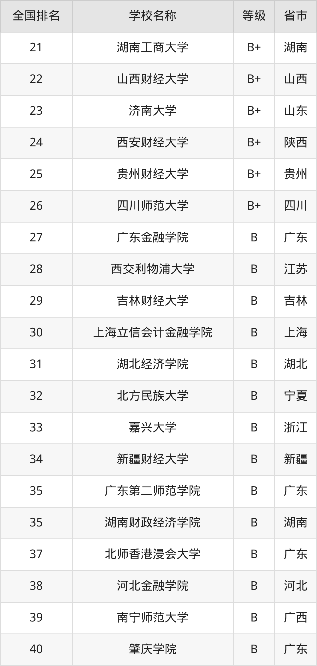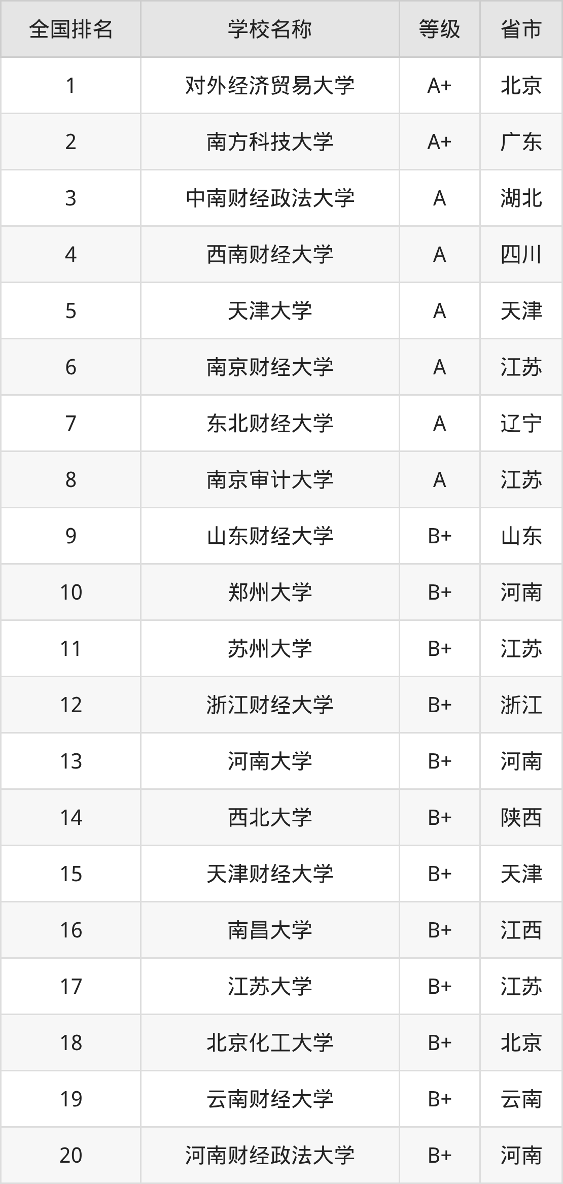 全国金融数学开设院校参与排名的共有43所,实力最强的是对外经济贸易大学(全国排名第1名),其专业实力等级被评为A+级。