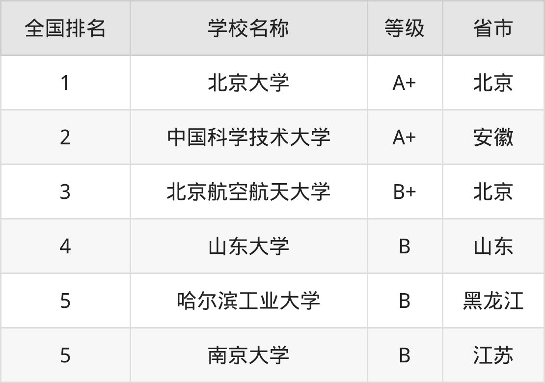 下面是空间科学与技术专业全国排名前6的大学名单及实力评级: