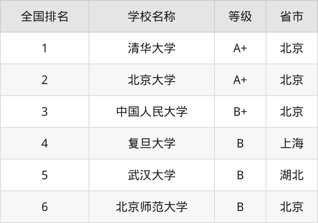 下面是政治学、经济学与哲学专业全国排名前6的大学名单及实力评级: