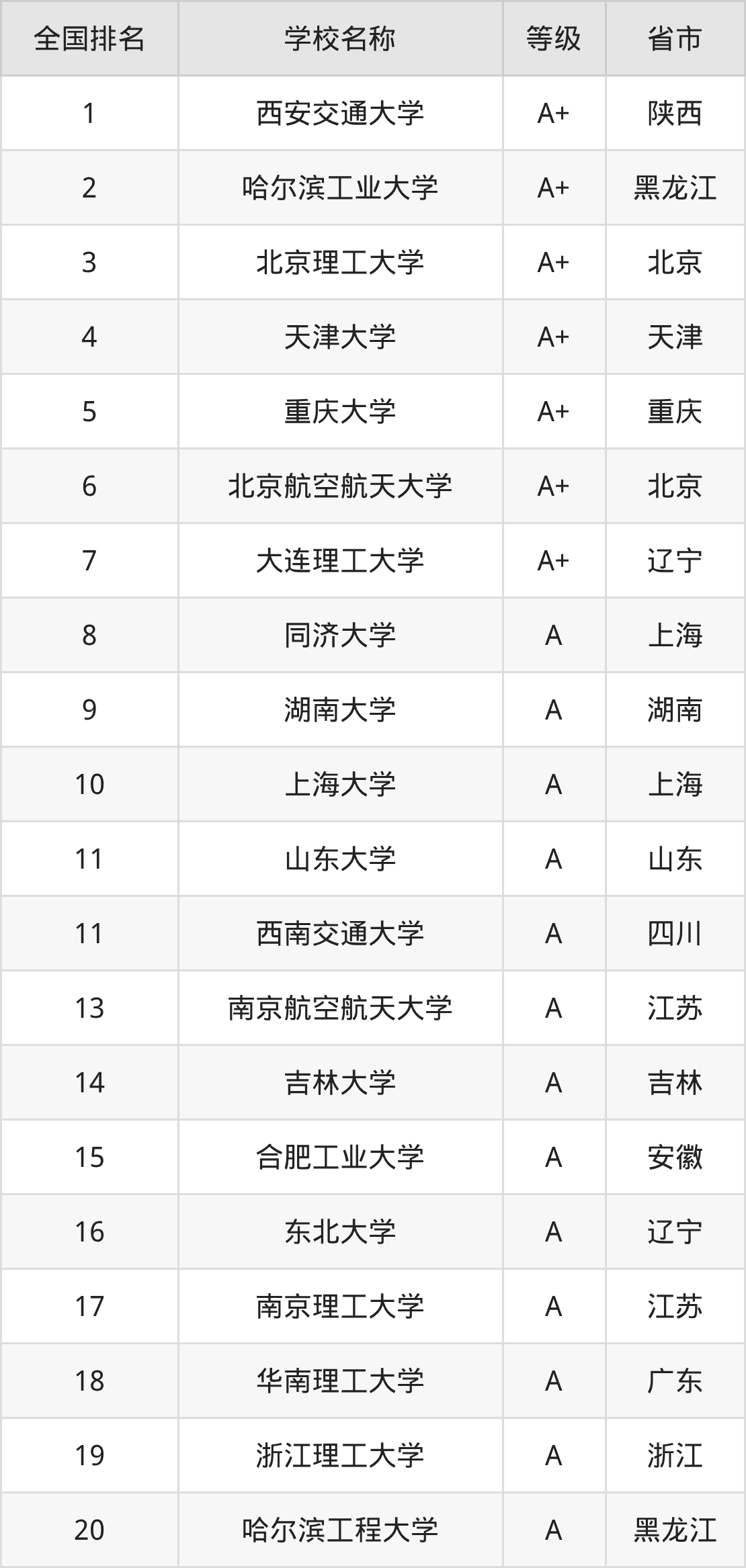 全国智能制造工程开设院校参与排名的共有188所,实力最强的是西安交通大学(全国排名第1名),其专业实力等级被评为A+级。