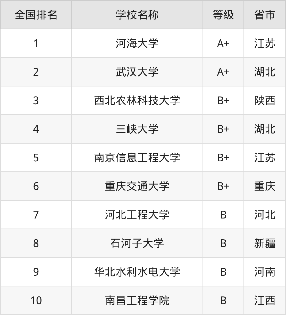 下面是智慧水利专业全国排名前10的大学名单及实力评级: