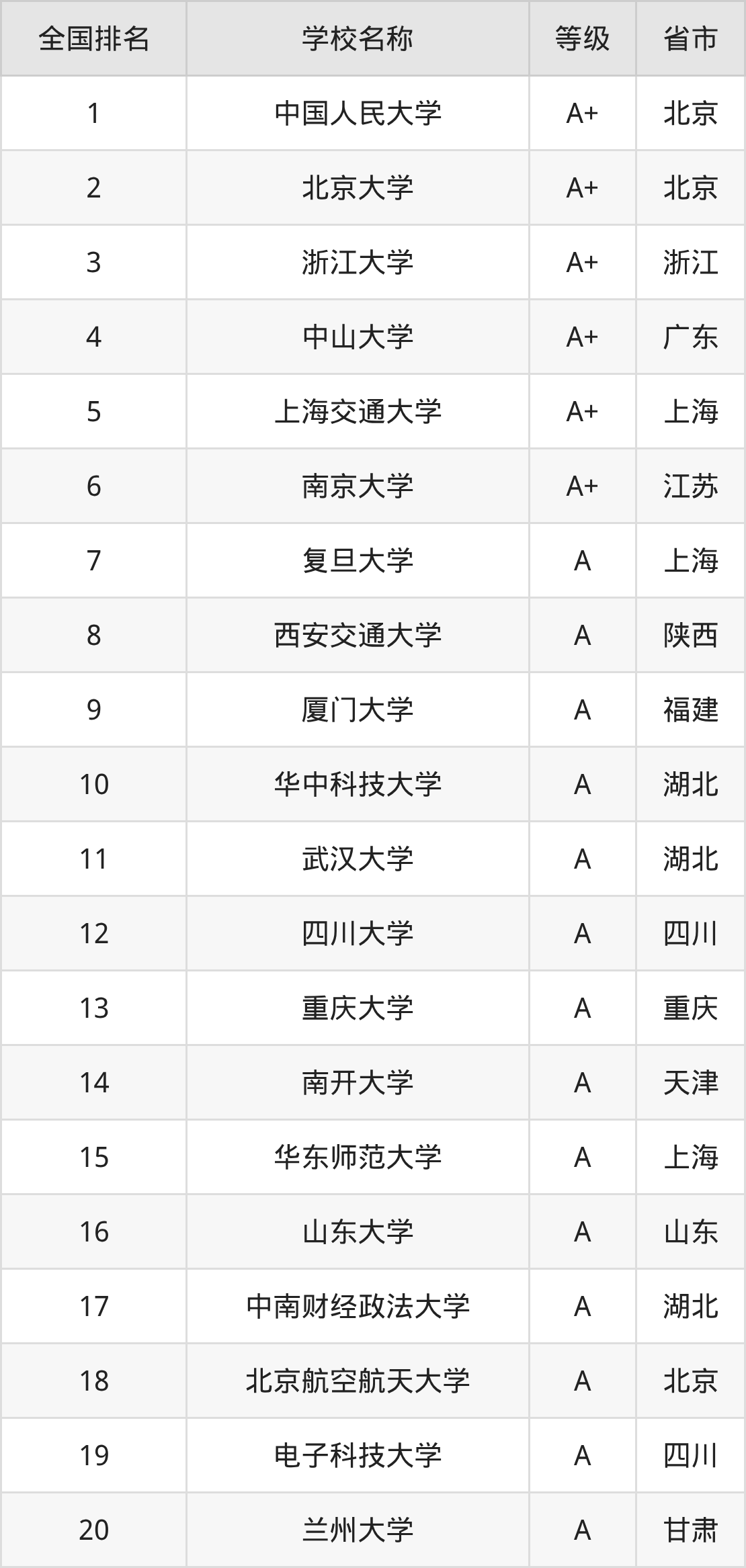 下面是行政管理专业全国排名前10的大学名单及实力评级: