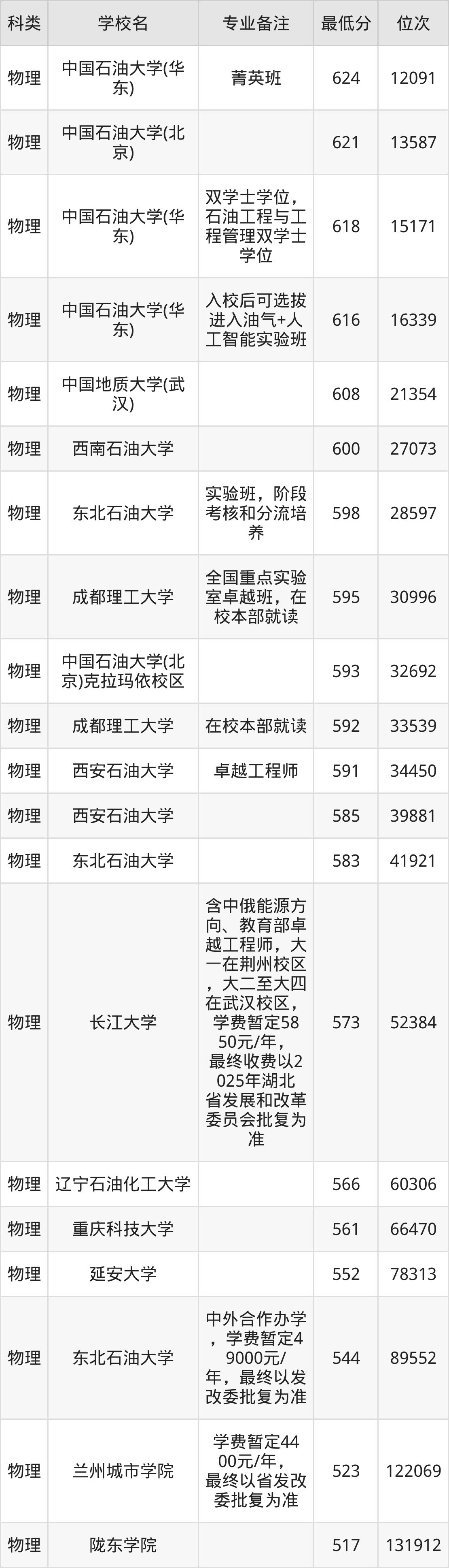 2025年全国大学石油工程录取分数线在483分~624分之间。数据显示,考生如果想报考公办大学,分数要在517分及以上,最低分院校有陇东学院等。