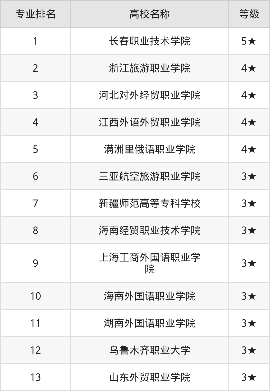 全国应用俄语开设院校参与排名的共有13所,实力最强的是长春职业技术学院(全国排名第1名),其专业实力等级被评为5★级。