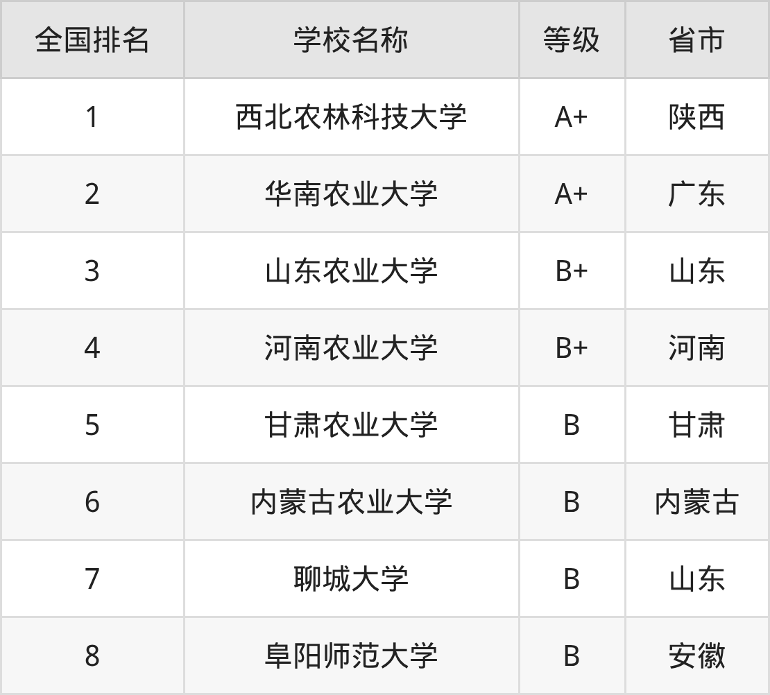全国智慧牧业科学与工程开设院校参与排名的共有8所,实力最强的是西北农林科技大学(全国排名第1名),其专业实力等级被评为A+级。