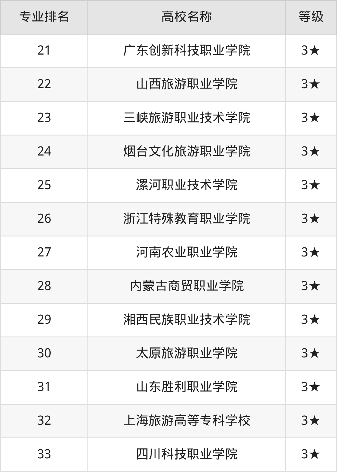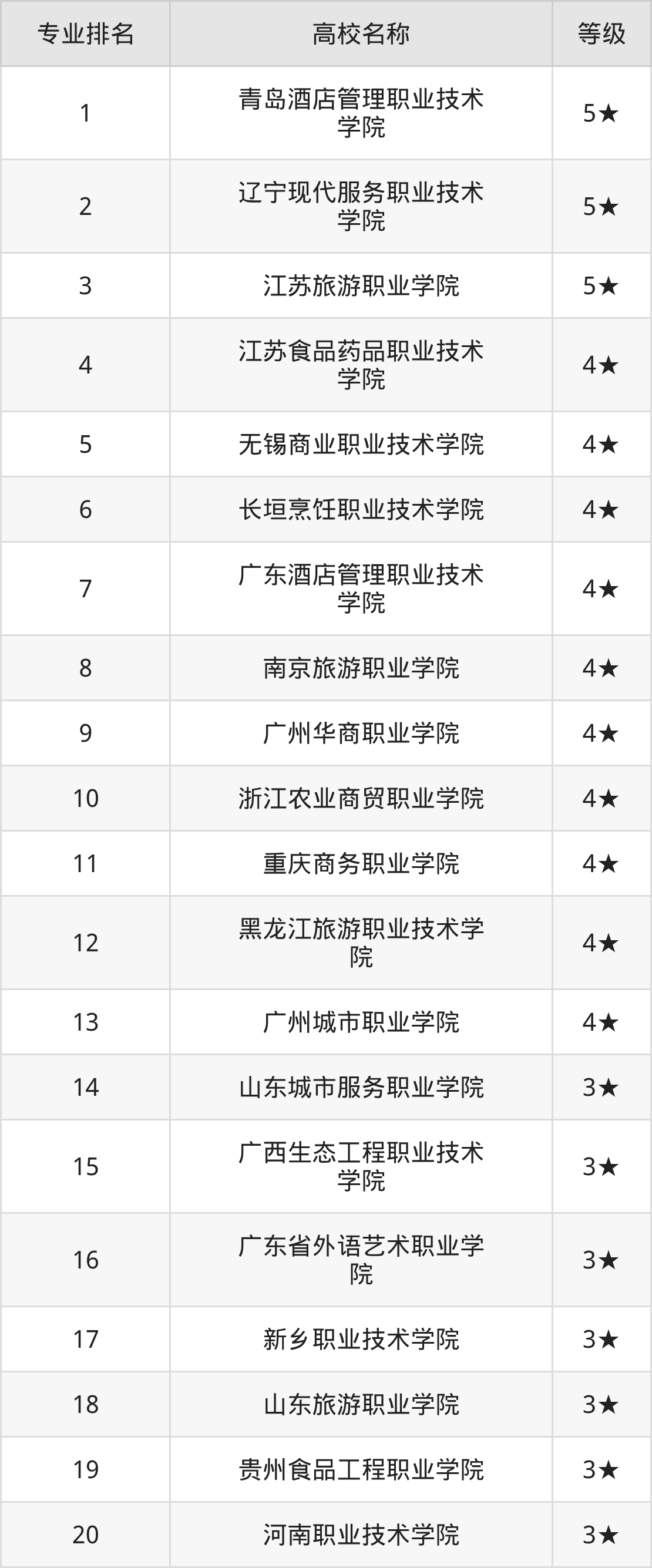 全国中西面点工艺开设院校参与排名的共有33所,实力最强的是青岛酒店管理职业技术学院(全国排名第1名),其专业实力等级被评为5★级。
