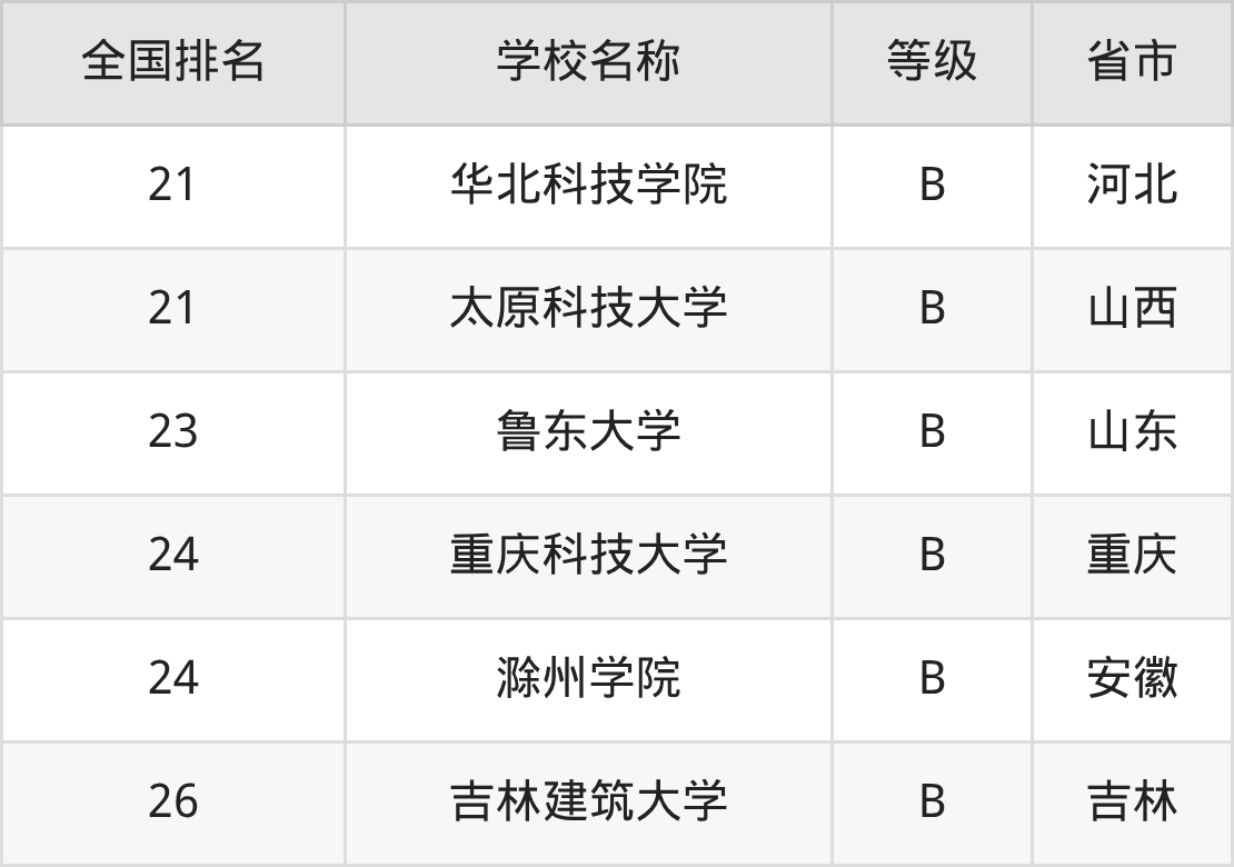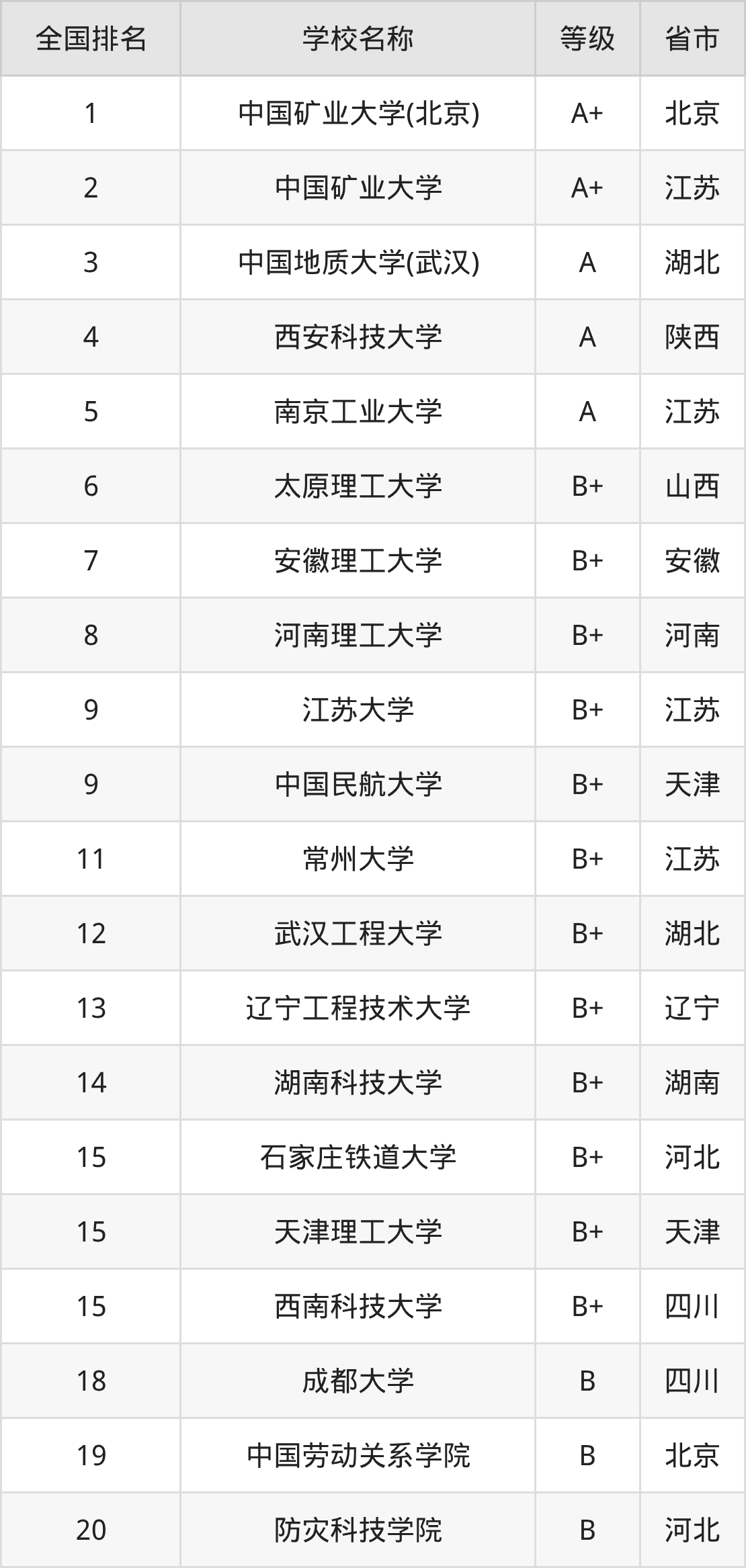 全国应急技术与管理开设院校参与排名的共有26所,实力最强的是中国矿业大学(北京)(全国排名第1名),其专业实力等级被评为A+级。