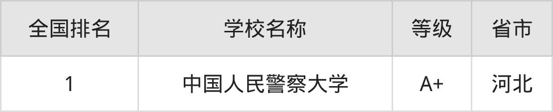全国边防管理开设院校参与排名的共有1所,实力最强的是中国人民警察大学(全国排名第1名),其专业实力等级被评为A+级。