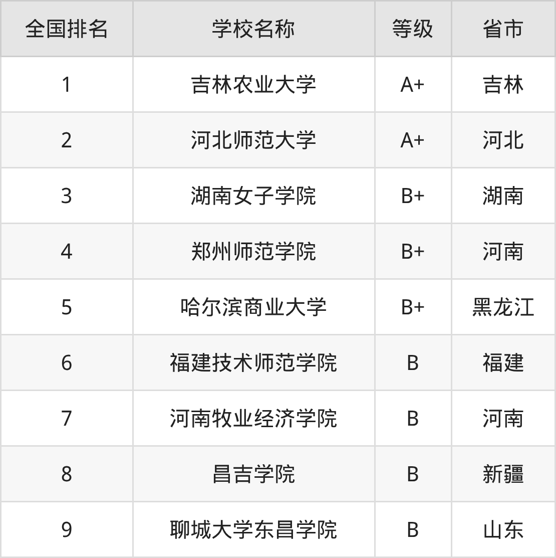 全国家政学开设院校参与排名的共有9所,实力最强的是吉林农业大学(全国排名第1名),其专业实力等级被评为A+级。