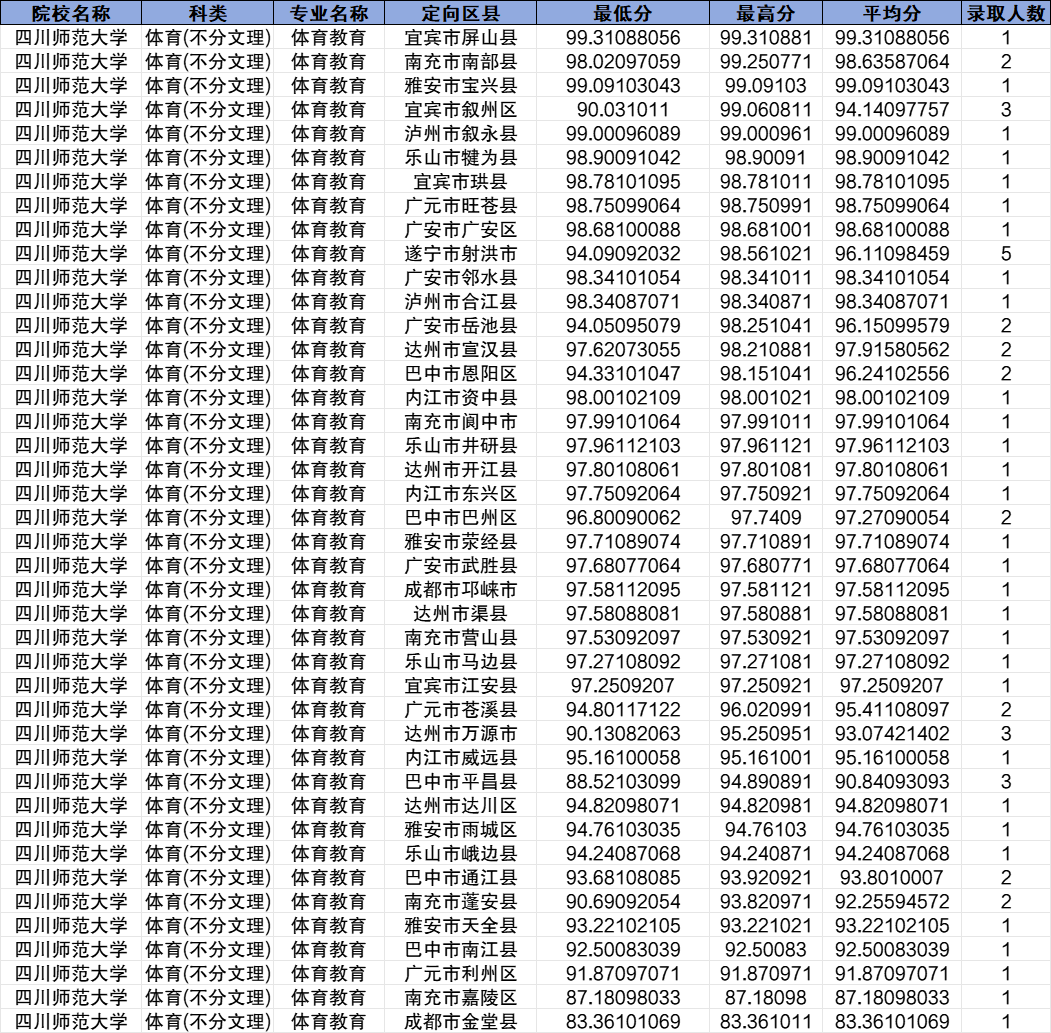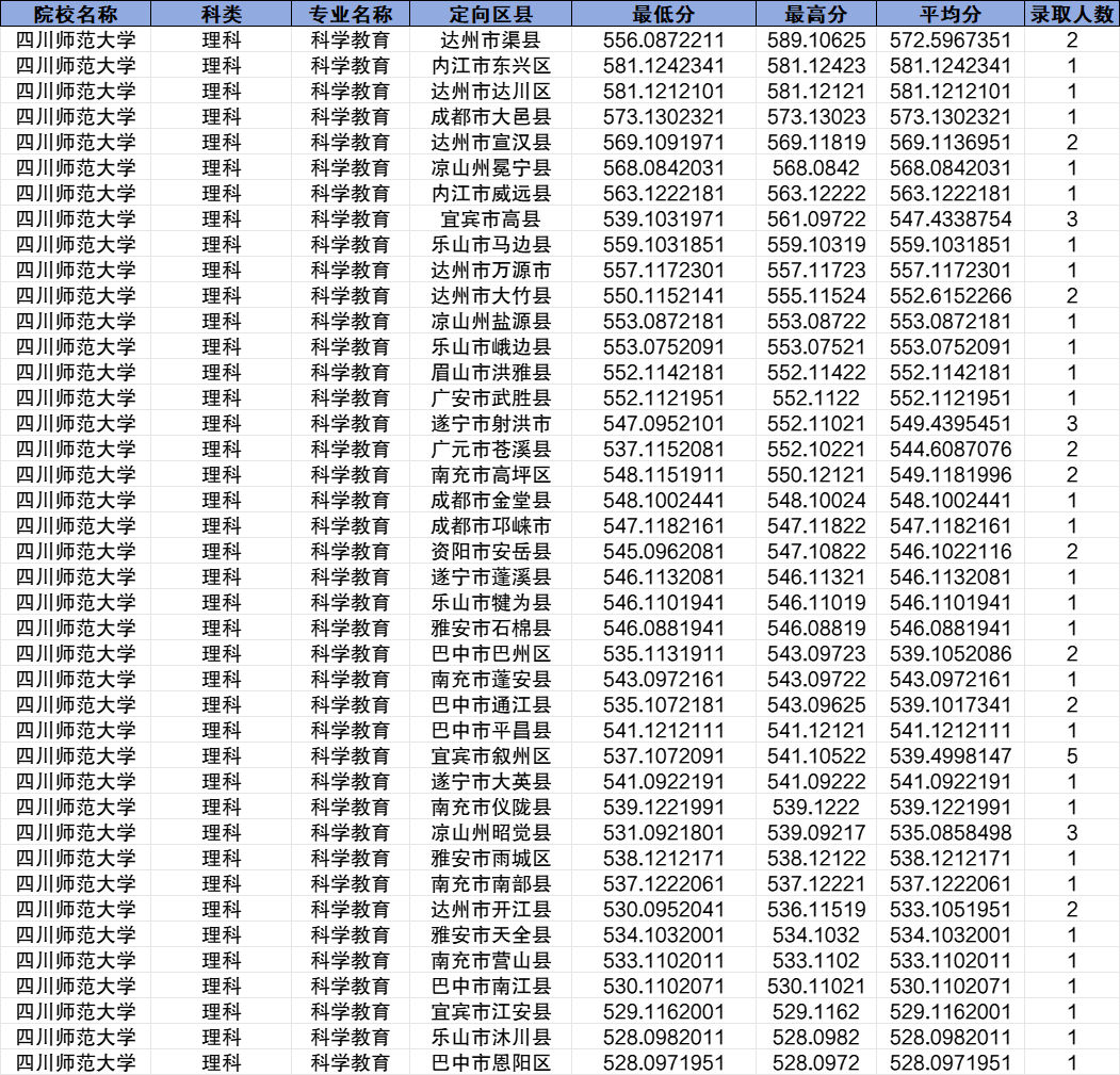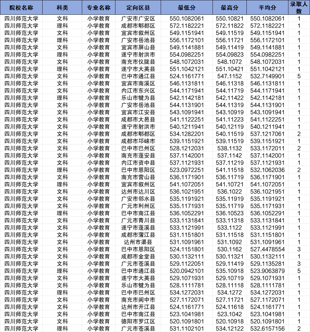 小学教育:文科最低分520分(罗江区)、文科最高分550分(广安区);理科最低分520分(通江县),理科最高分572分(郫都区)。