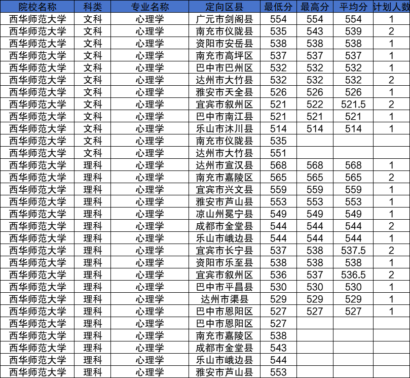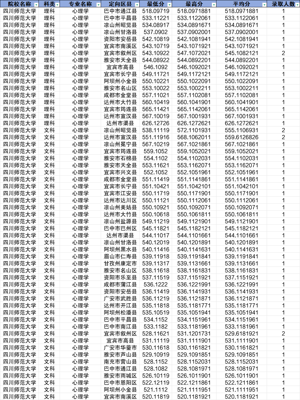 心理学:文科最低分520分(南溪区)、文科最高分572分(昭觉县);理科最低分518分(通江县),理科最高分626分(渠县)。