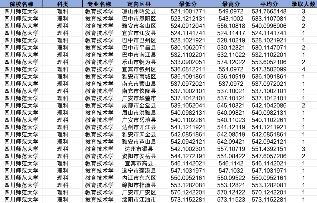 教育技术学:理科最低分521分(昭觉县),理科最高分574分(犍为县)。