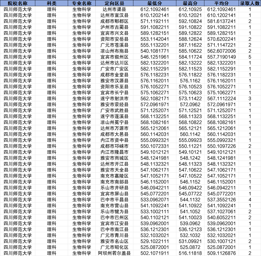生物科学:理科最低分502分(若尔盖县),理科最高分612分(渠县)。
