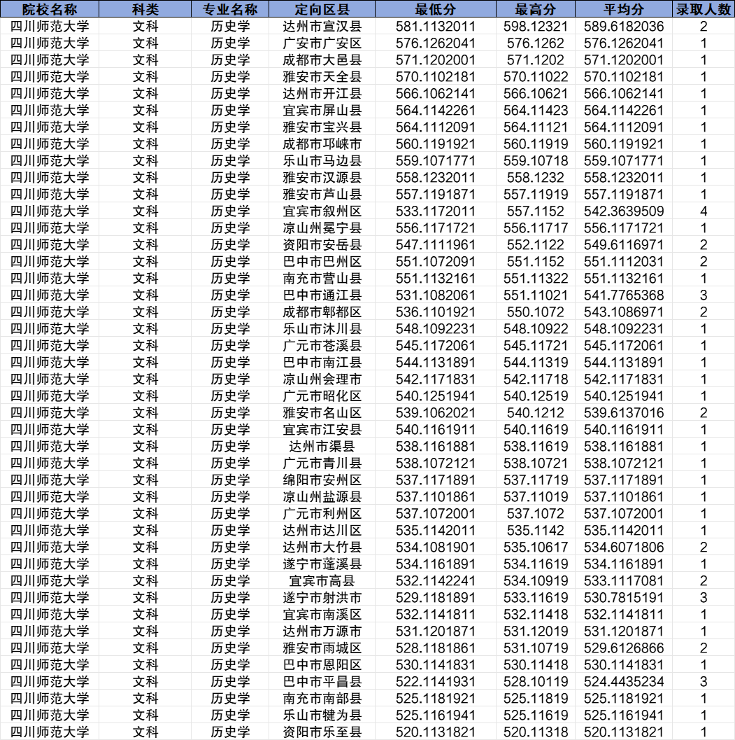 历史学:文科最低分520分(乐至县),文科最高分598分(宣汉县)。