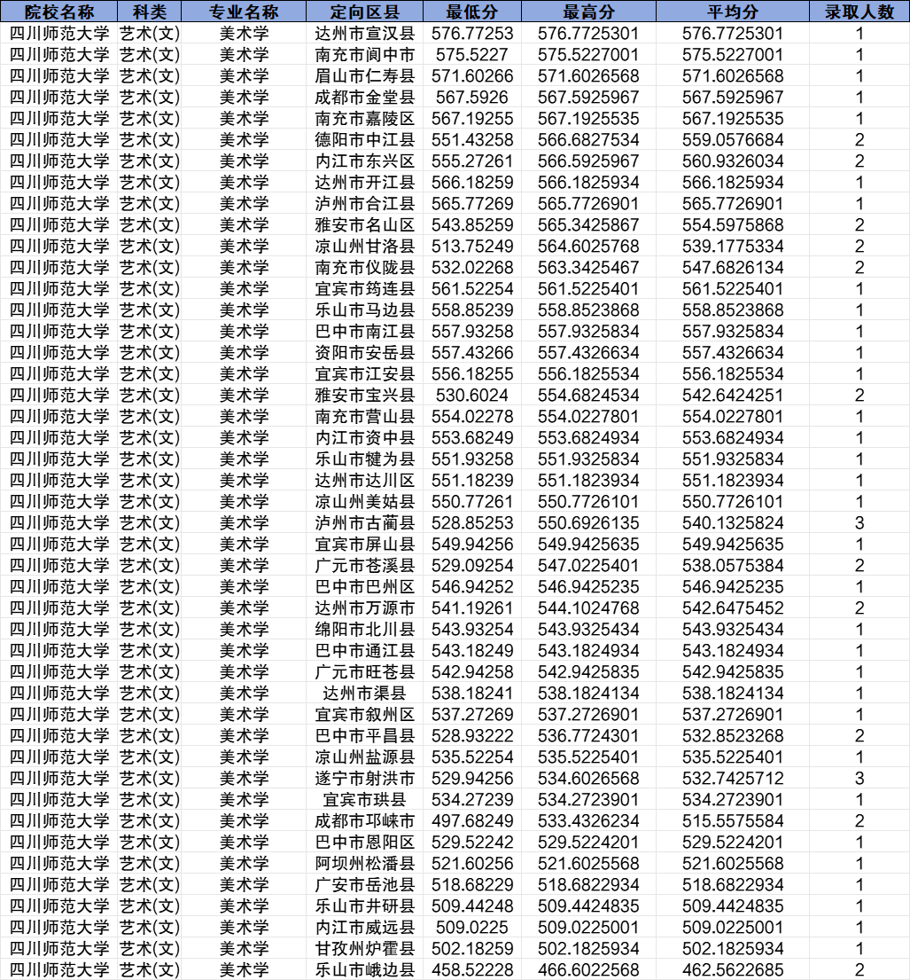 美术学:文科最低分458.5分(峨边县),文科最高分576.77分(宣汉县)。