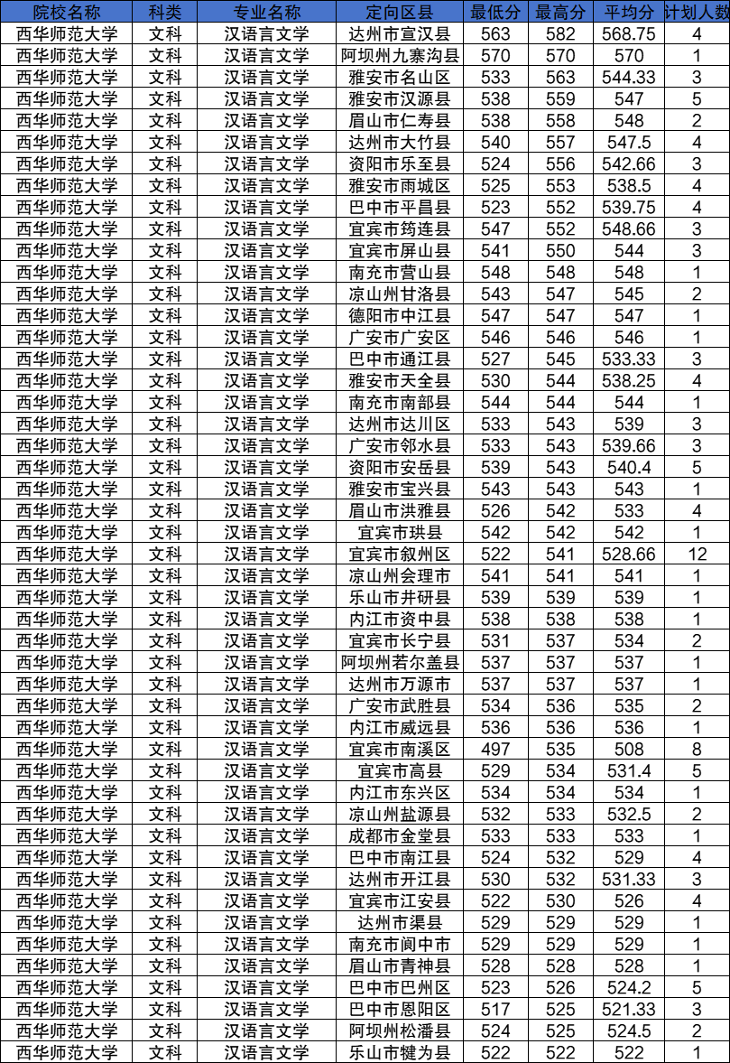 汉语言文学最高分582分(宣汉县),最低分497分(南溪区)。