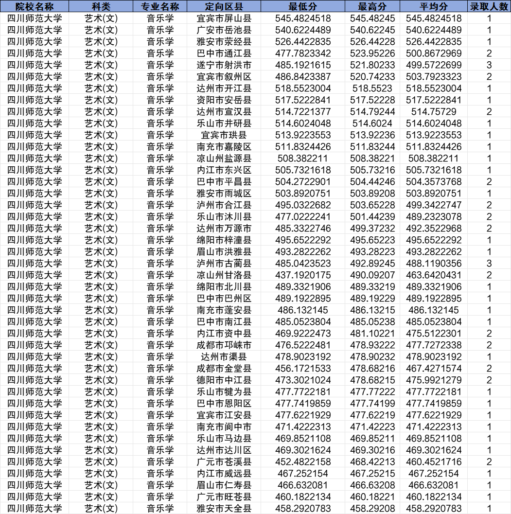 音乐学:文科最低分437分(甘洛县),文科最高分545分(屏山县)。