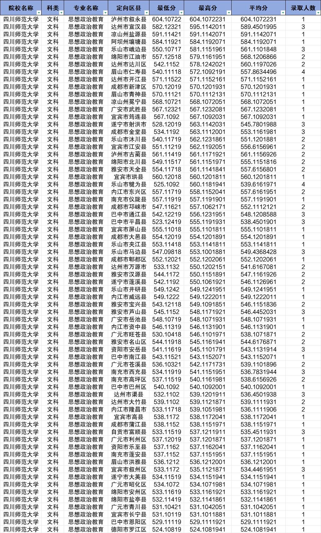 思想政治教育:文科最低分523分(平昌县)、文科最高分604分(叙永县)。