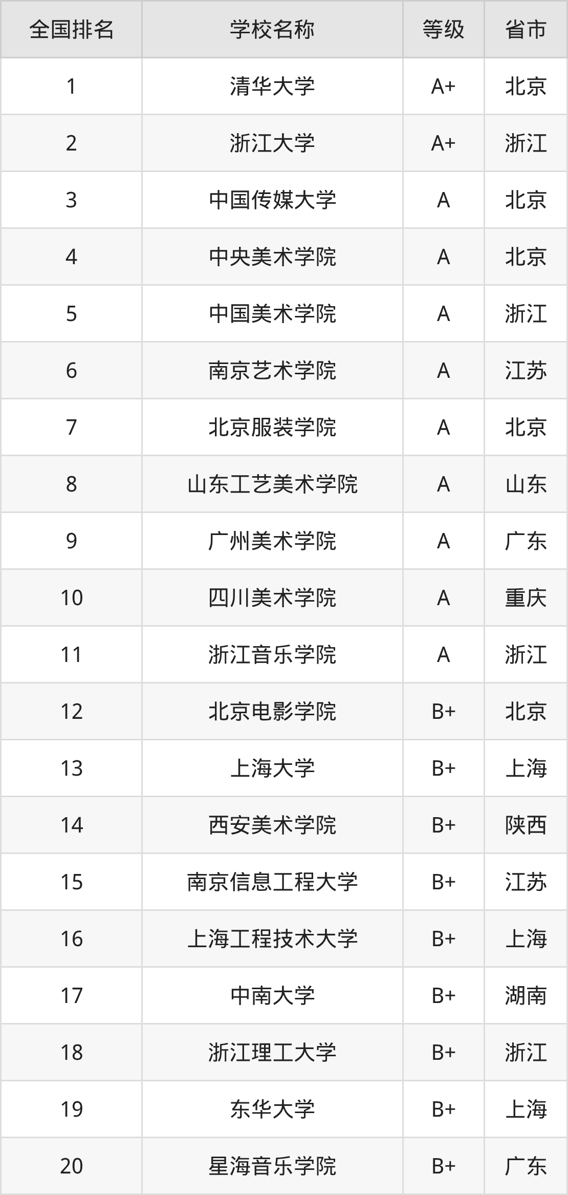 全国艺术与科技开设院校参与排名的共有59所,实力最强的是清华大学(全国排名第1名),其专业实力等级被评为A+级。
