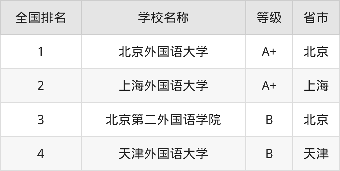 全国塞尔维亚语开设院校参与排名的共有4所,实力最强的是北京外国语大学(全国排名第1名),其专业实力等级被评为A+级。