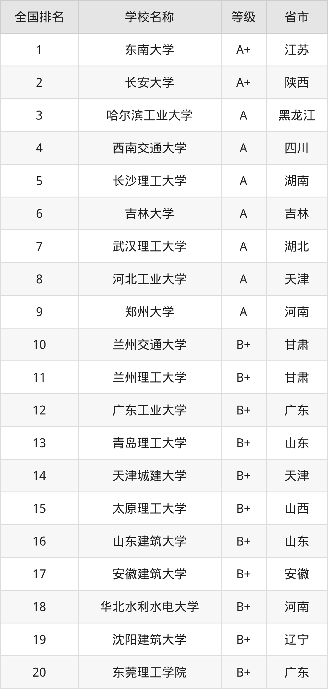 下面是道路桥梁与渡河工程专业全国排名前10的大学名单及实力评级: