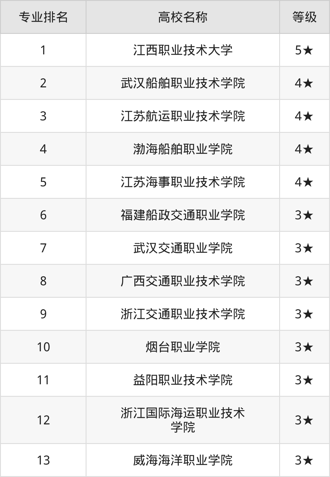 全国船舶工程技术开设院校参与排名的共有13所,实力最强的是江西职业技术大学(全国排名第1名),其专业实力等级被评为5★级。
