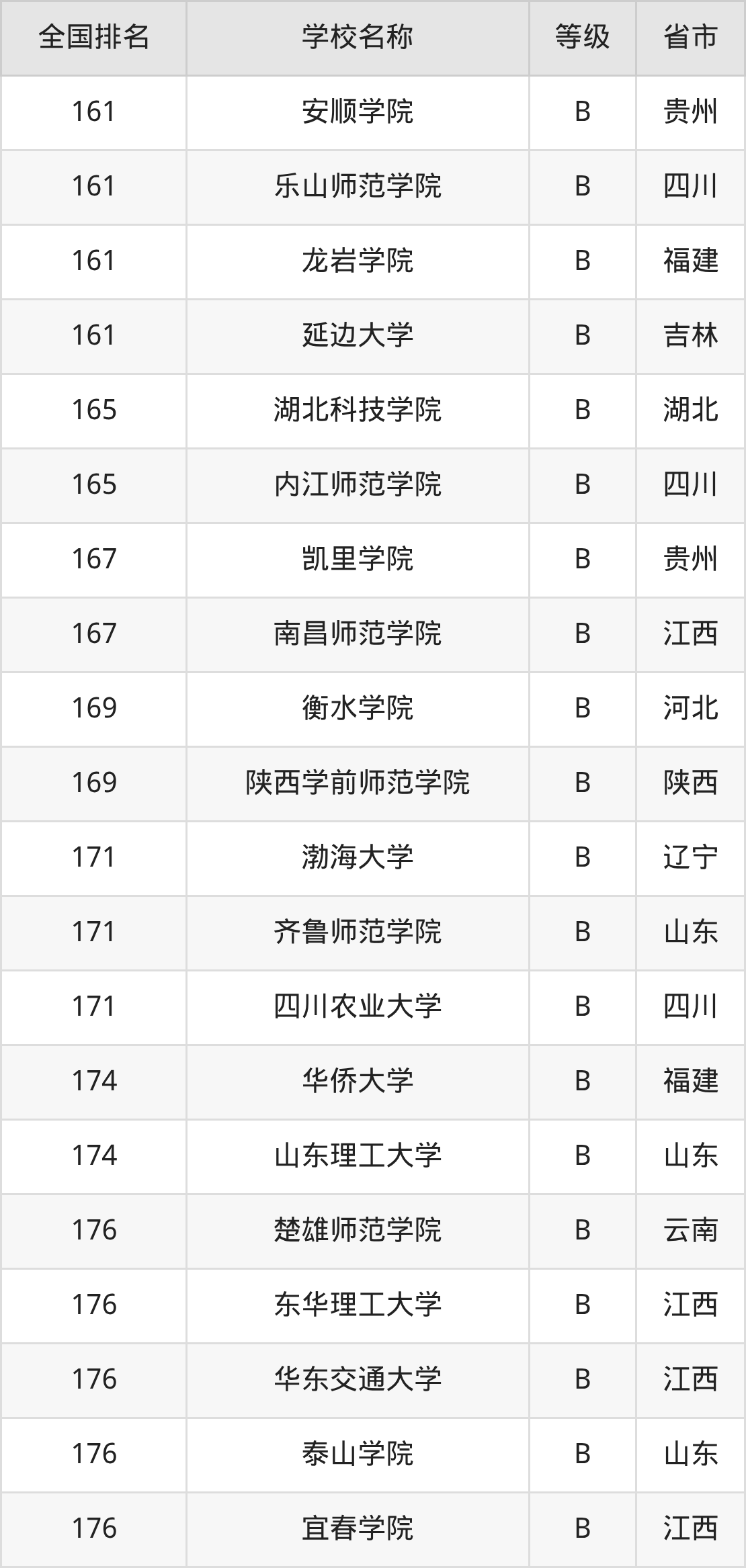 全国体育教育开设院校参与排名的共有193所,实力最强的是华东师范大学(全国排名第1名),其专业实力等级被评为A+级。