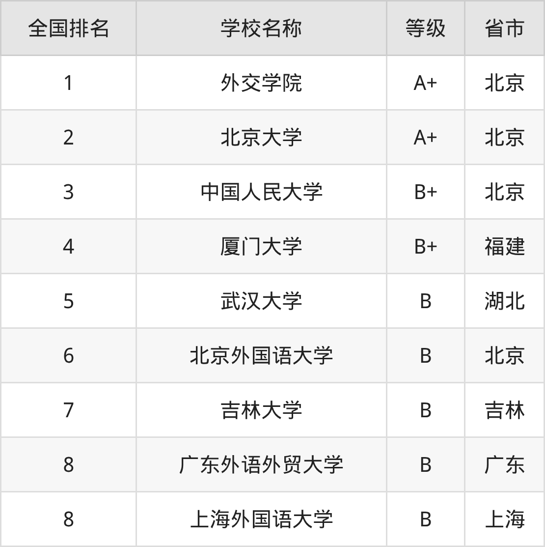 下面是外交学专业全国排名前9的大学名单及实力评级: