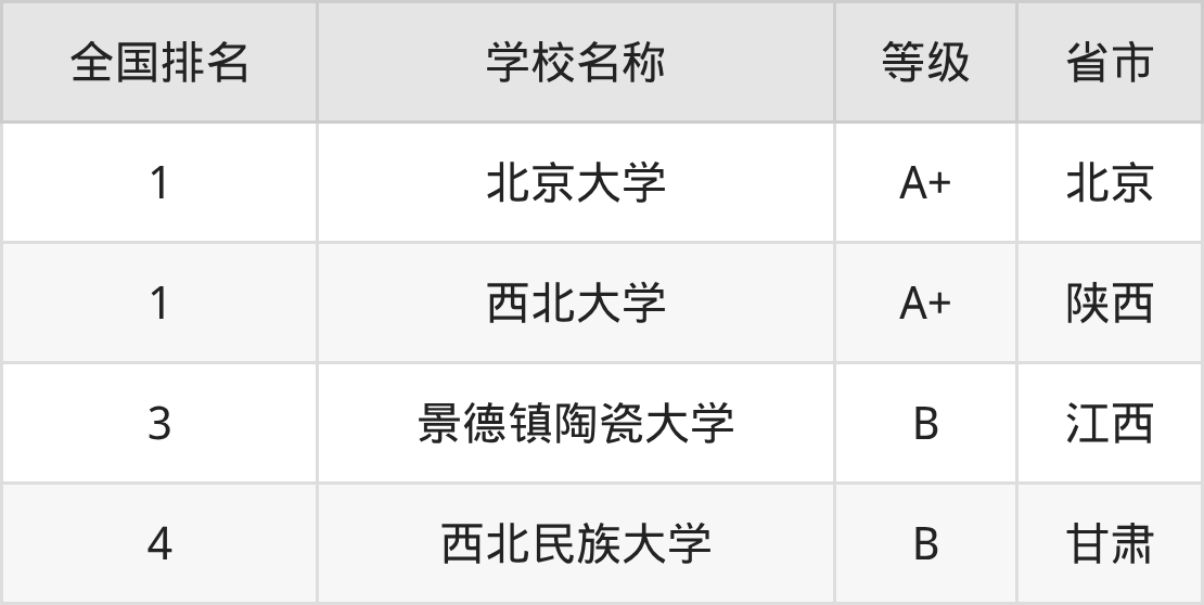 下面是文物保护技术专业全国排名前4的大学名单及实力评级: