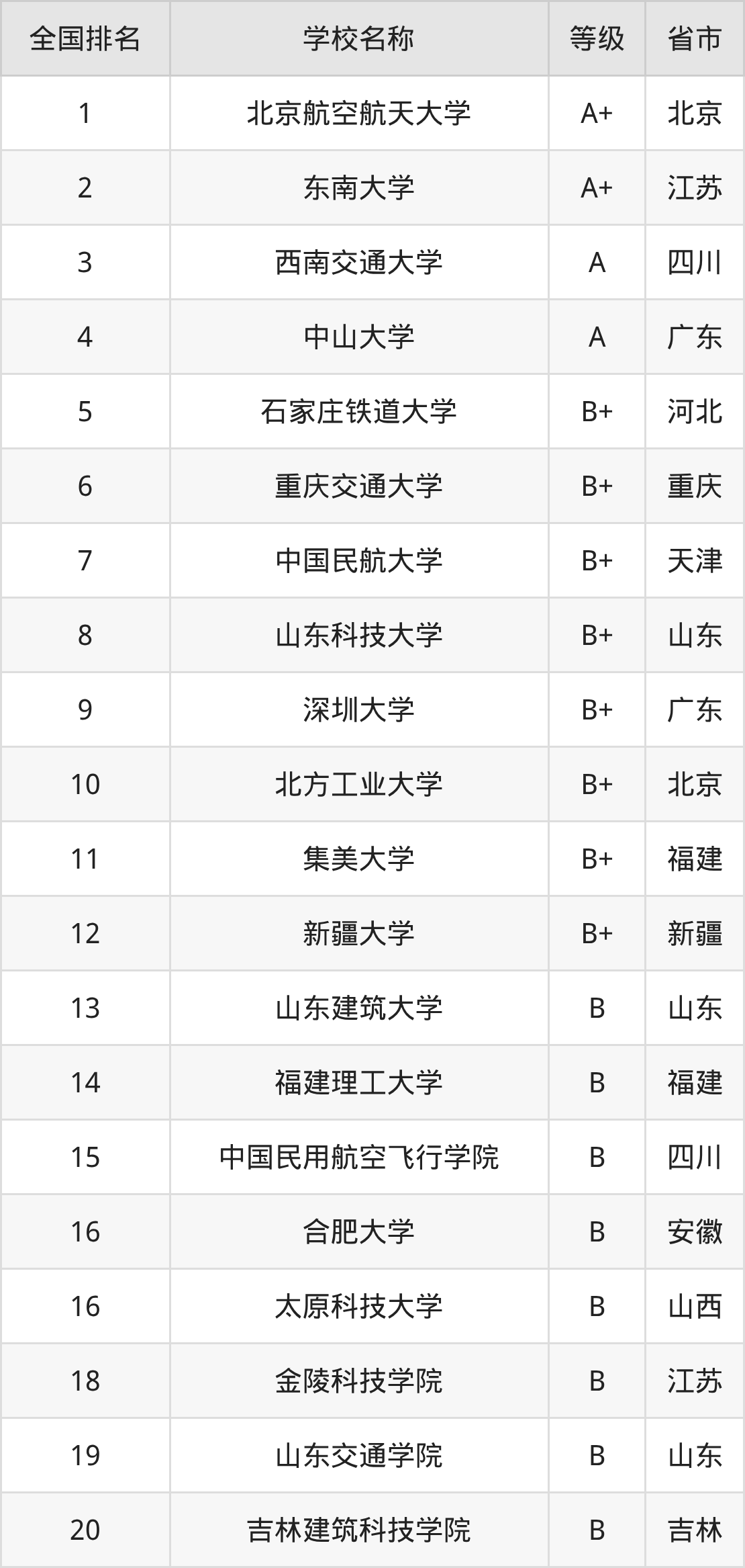 全国智慧交通开设院校参与排名的共有20所,实力最强的是北京航空航天大学(全国排名第1名),其专业实力等级被评为A+级。