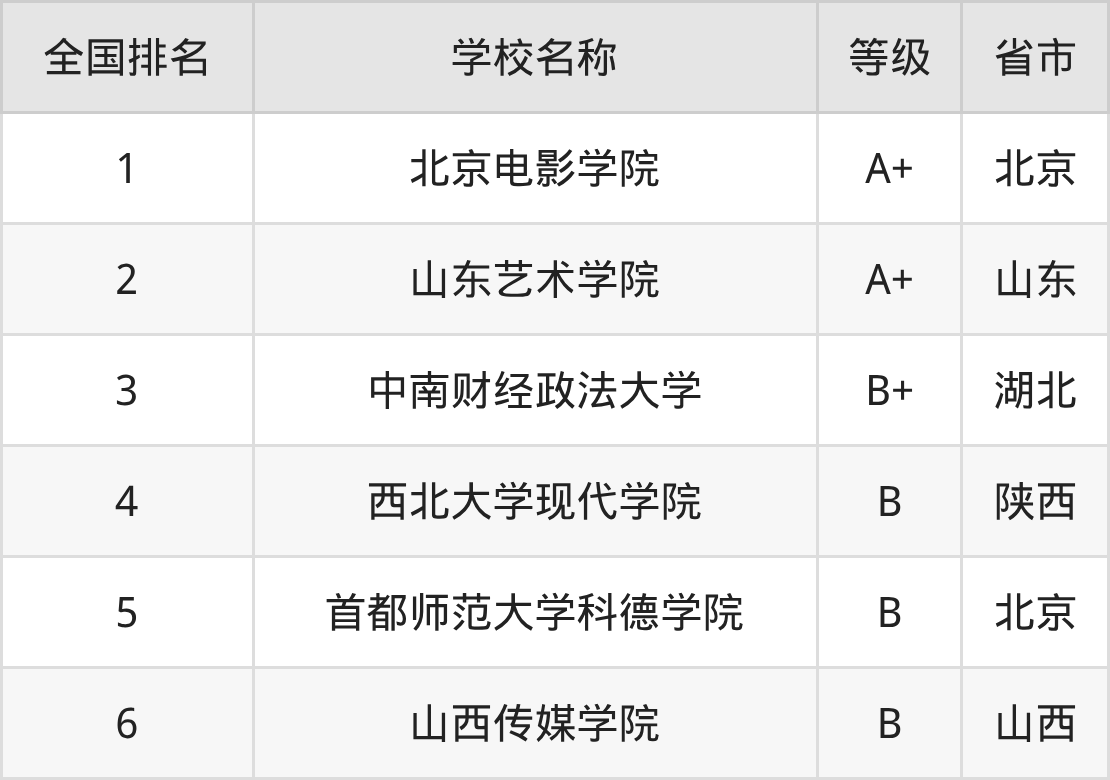 下面是电影学专业全国排名前6的大学名单及实力评级: