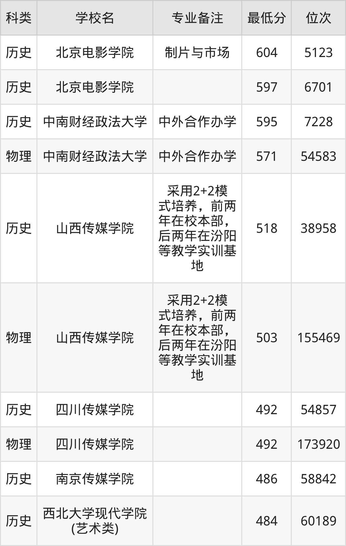 2025年全国大学电影学录取分数线在484分~604分之间。数据显示,考生如果想报考公办大学,分数要在503分及以上,最低分院校有山西传媒学院等。