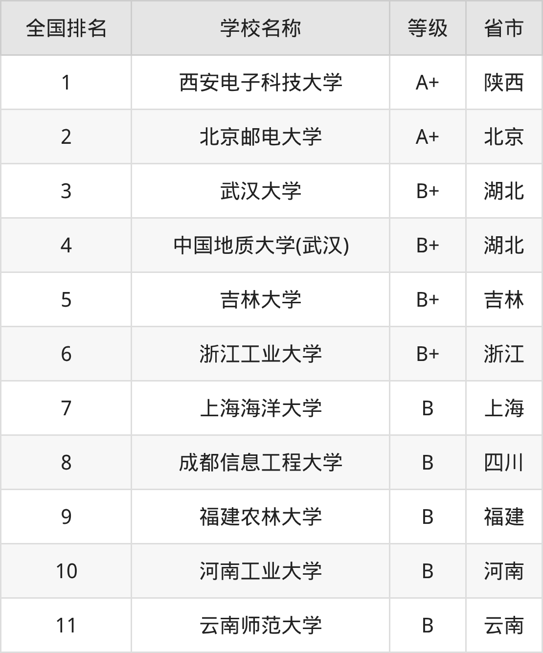 全国空间信息与数字技术开设院校参与排名的共有11所,实力最强的是西安电子科技大学(全国排名第1名),其专业实力等级被评为A+级。