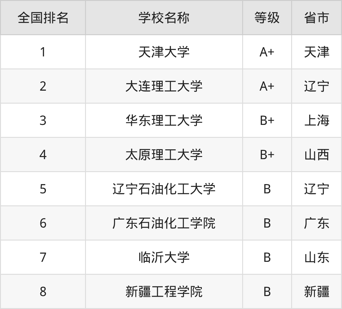 下面是精细化工专业全国排名前8的大学名单及实力评级:
