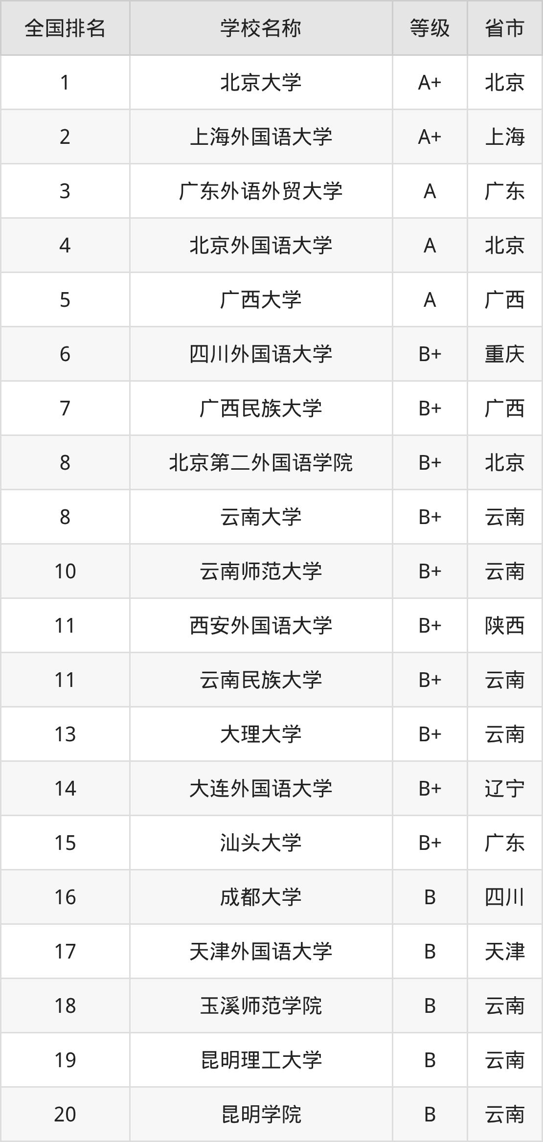 全国泰语开设院校参与排名的共有25所,实力最强的是北京大学(全国排名第1名),其专业实力等级被评为A+级。