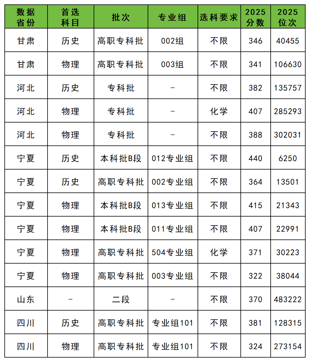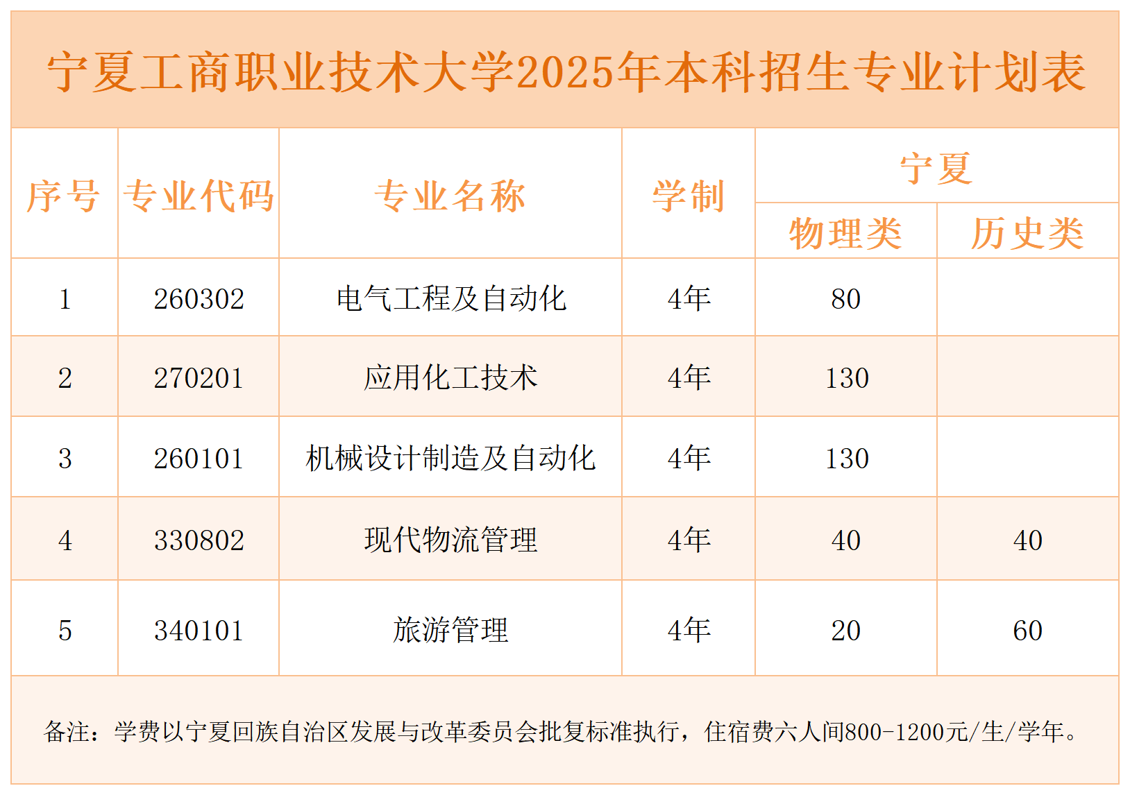 本科招生只在宁夏进行,2025年物理类最低407分,历史类最低440分。