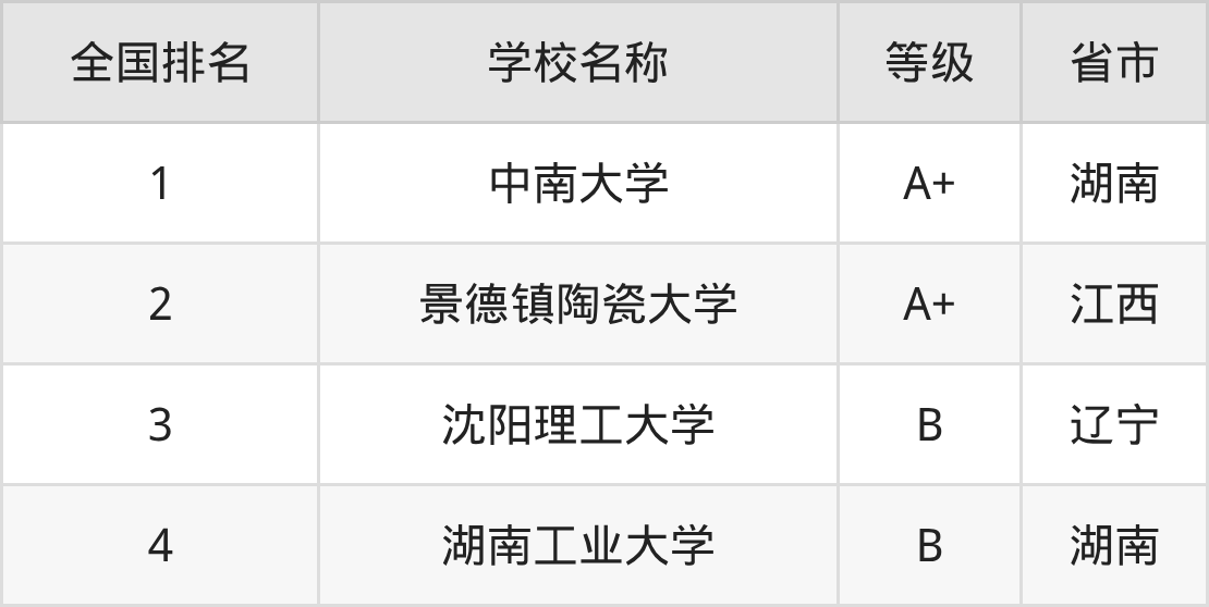 全国粉体材料科学与工程开设院校参与排名的共有4所,实力最强的是中南大学(全国排名第1名),其专业实力等级被评为A+级。