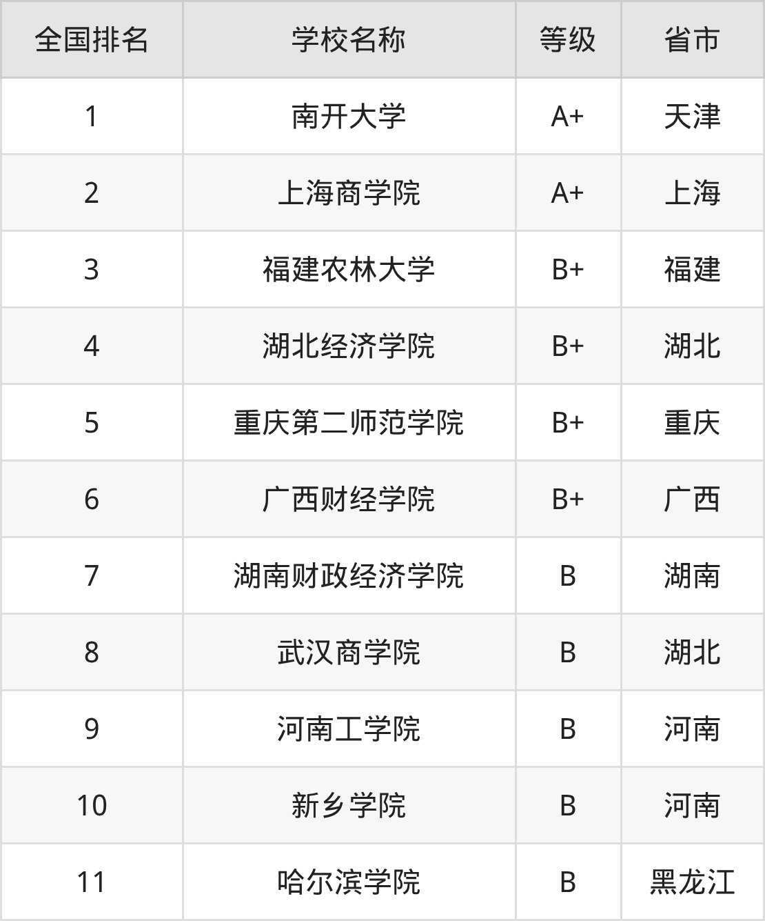 全国商务经济学开设院校参与排名的共有11所,实力最强的是南开大学(全国排名第1名),其专业实力等级被评为A+级。