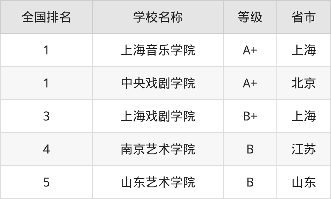 下面是音乐剧专业全国排名前5的大学名单及实力评级: