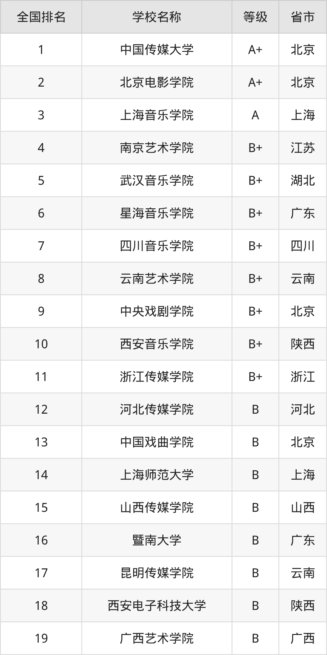 全国录音艺术开设院校参与排名的共有19所,实力最强的是中国传媒大学(全国排名第1名),其专业实力等级被评为A+级。
