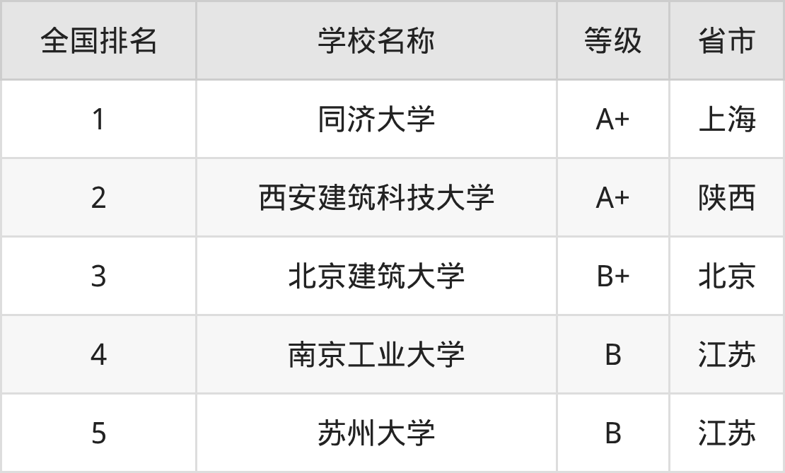 全国历史建筑保护工程开设院校参与排名的共有5所,实力最强的是同济大学(全国排名第1名),其专业实力等级被评为A+级。