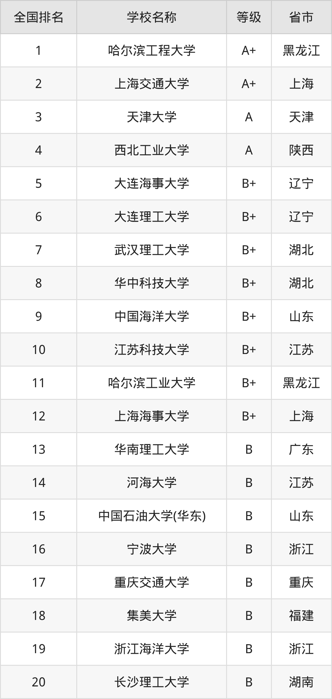 全国船舶与海洋工程开设院校参与排名的共有20所,实力最强的是哈尔滨工程大学(全国排名第1名),其专业实力等级被评为A+级。