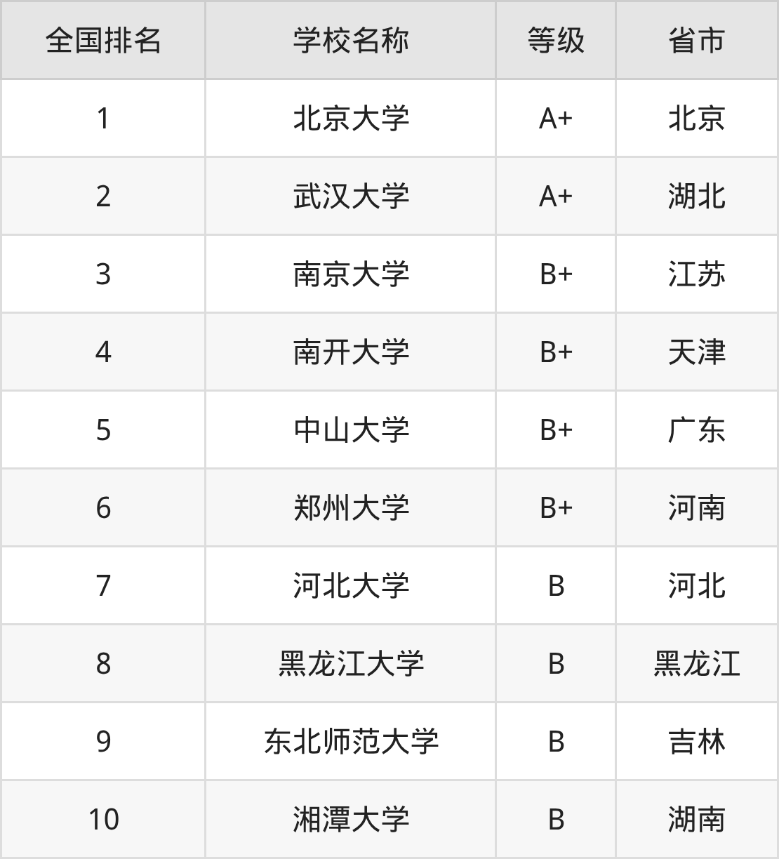 全国图书馆学开设院校参与排名的共有10所,实力最强的是北京大学(全国排名第1名),其专业实力等级被评为A+级。