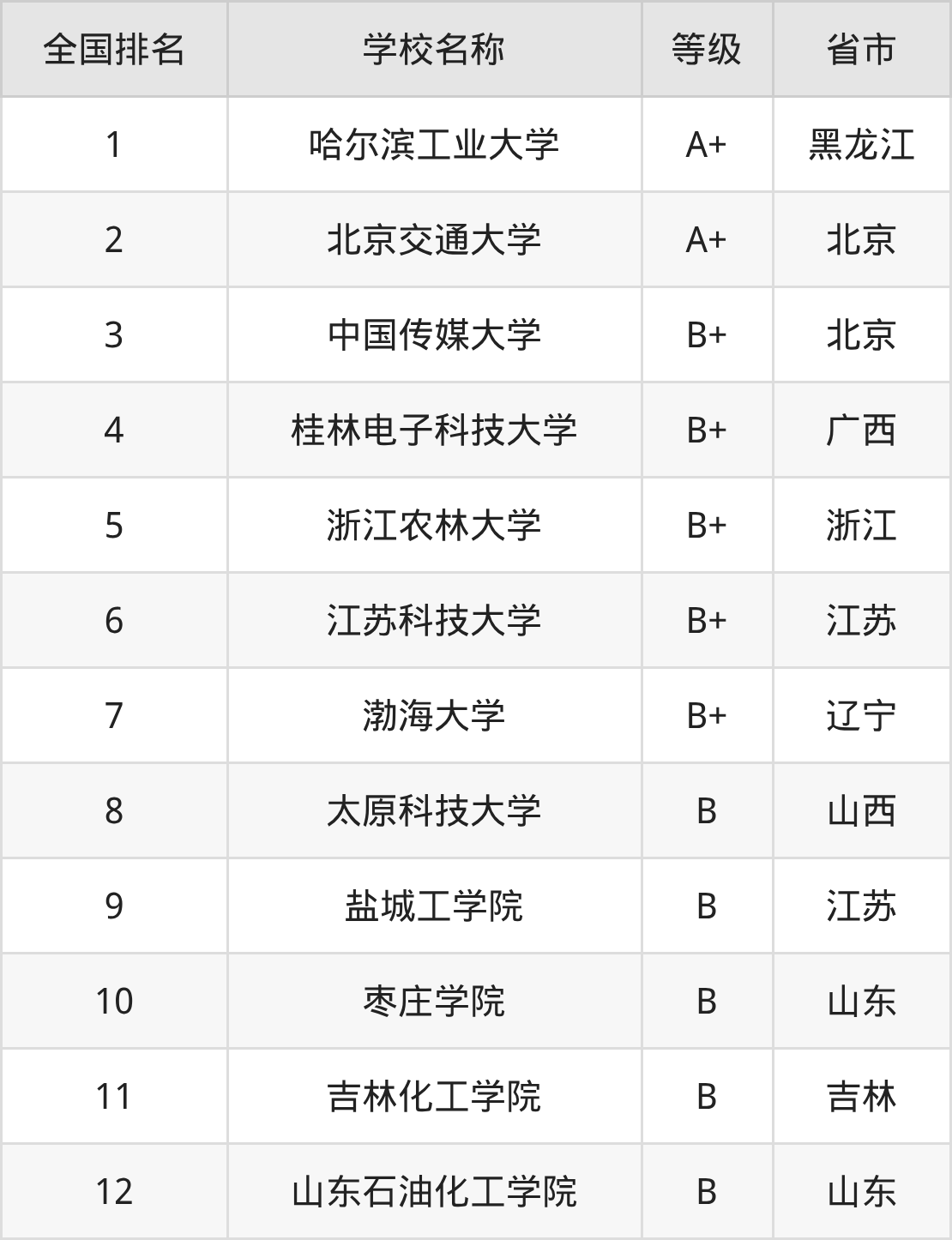 全国智能装备与系统开设院校参与排名的共有12所,实力最强的是哈尔滨工业大学(全国排名第1名),其专业实力等级被评为A+级。