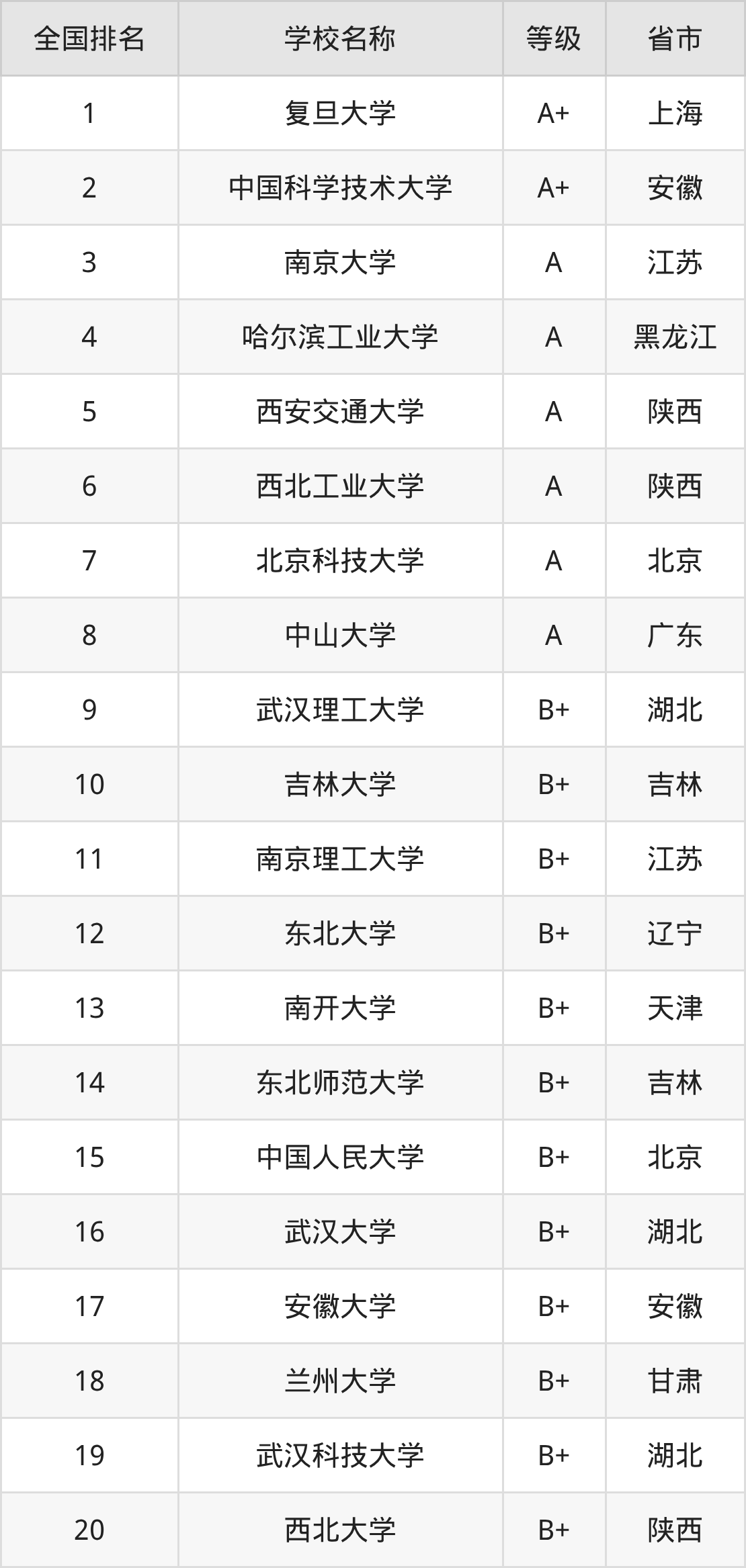全国材料物理开设院校参与排名的共有41所,实力最强的是复旦大学(全国排名第1名),其专业实力等级被评为A+级。