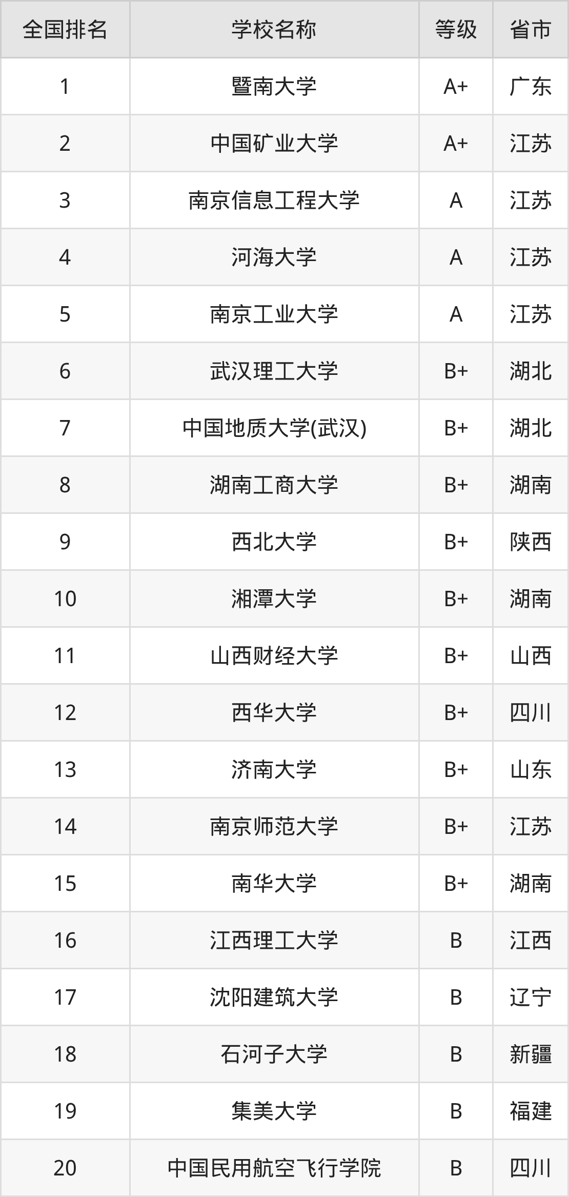 全国应急管理开设院校参与排名的共有26所,实力最强的是暨南大学(全国排名第1名),其专业实力等级被评为A+级。